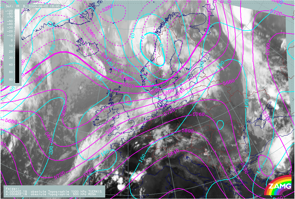 02 June 2000/18.00 UTC - Meteosat IR image; magenta: height contours 1000 hPa, cyan: height contours 500 hPa