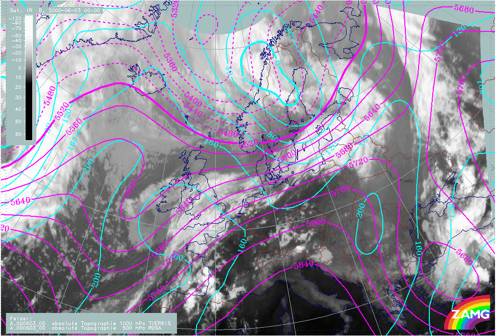 03 June 2000/00.00 UTC - Meteosat IR image; magenta: height contours 1000 hPa, cyan: height contours 500 hPa