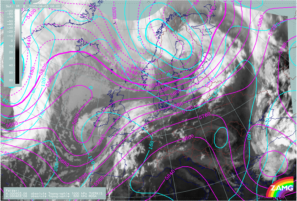 03 June 2000/06.00 UTC - Meteosat IR image; magenta: height contours 1000 hPa, cyan: height contours 500 hPa
