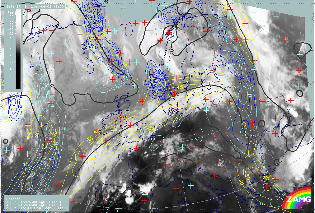02 June 2000/18.00 UTC - Meteosat IR image; blue: negative vorticity advection (NVA) 500 hPa, cyan: negative vorticity advection (NVA)