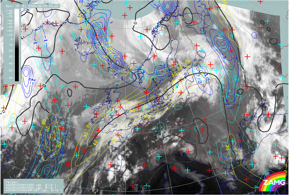 03 June 2000/00.00 UTC - Meteosat IR image; blue: negative vorticity advection (NVA) 500 hPa, cyan: negative vorticity advection (NVA)