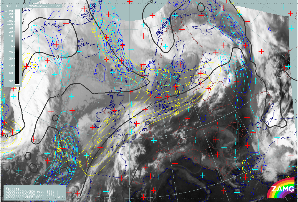 03 June 2000/06.00 UTC - Meteosat IR image; blue: negative vorticity advection (NVA) 500 hPa, cyan: negative vorticity advection (NVA)