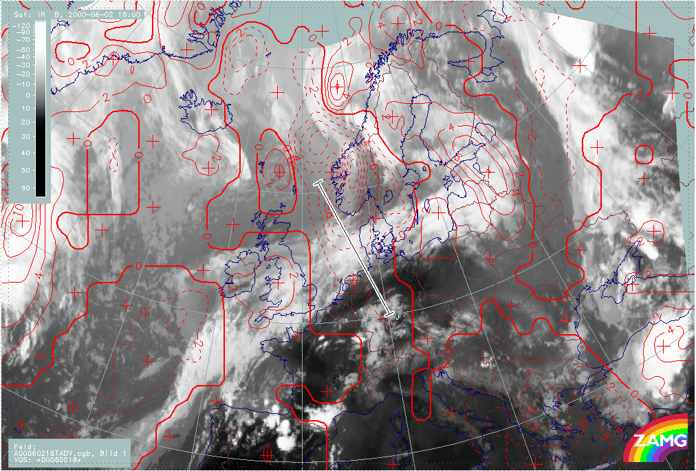 02 June 2000/18.00 UTC - Meteosat IR image; red dashed: temperature advection - CA 700 hPa, red solid: temperature advection - WA 700