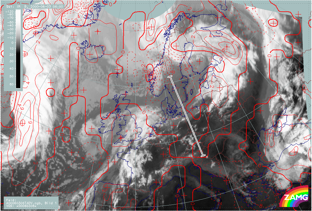 03 June 2000/00.00 UTC - Meteosat IR image; red dashed: temperature advection - CA 700 hPa, red solid: temperature advection - WA 700