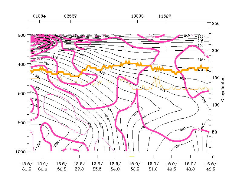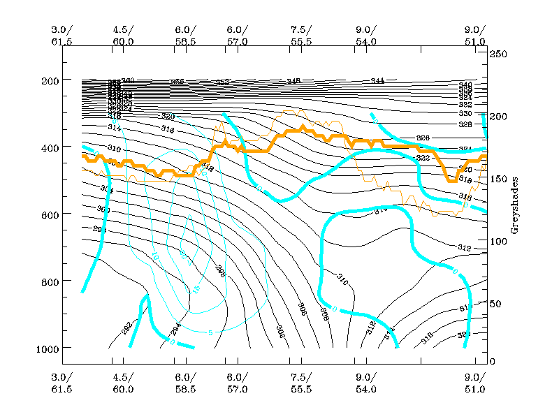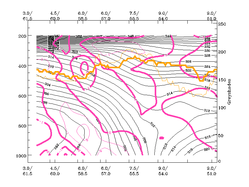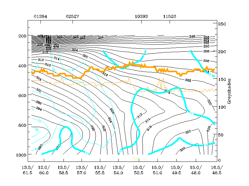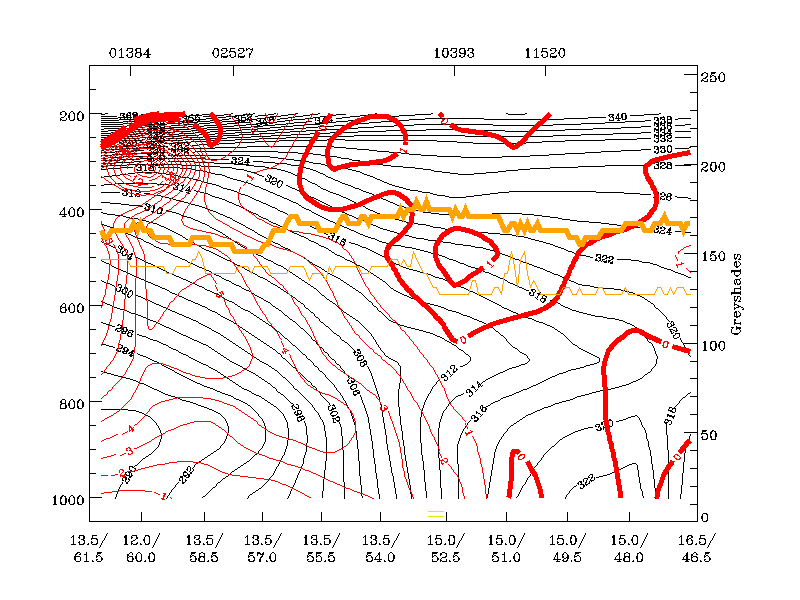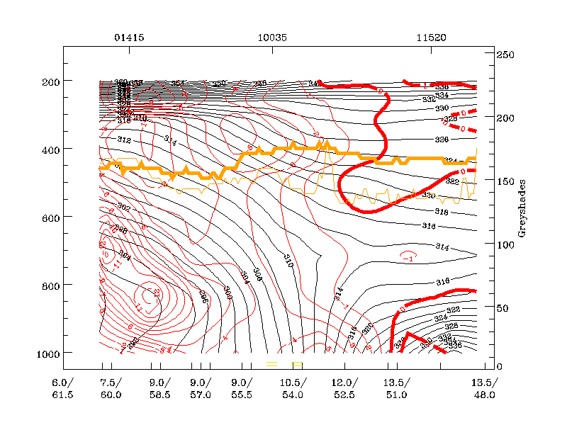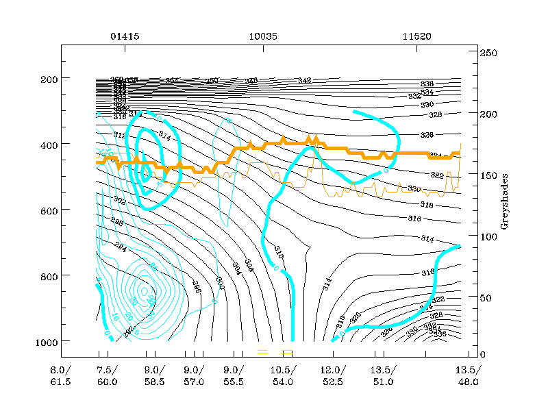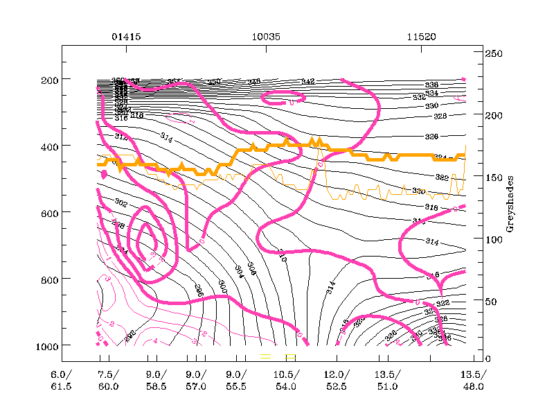 03 June 2000/00.00 UTC - Vertical cross section; black: isentropes (ThetaE), orange thin: IR pixel values, orange thick: WV pixel values