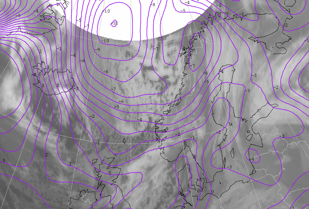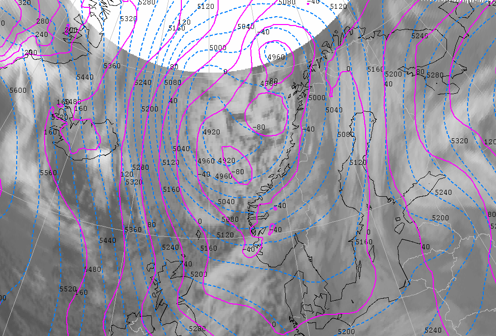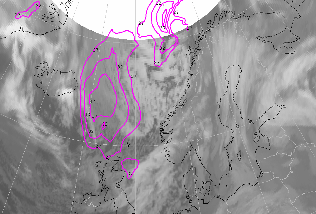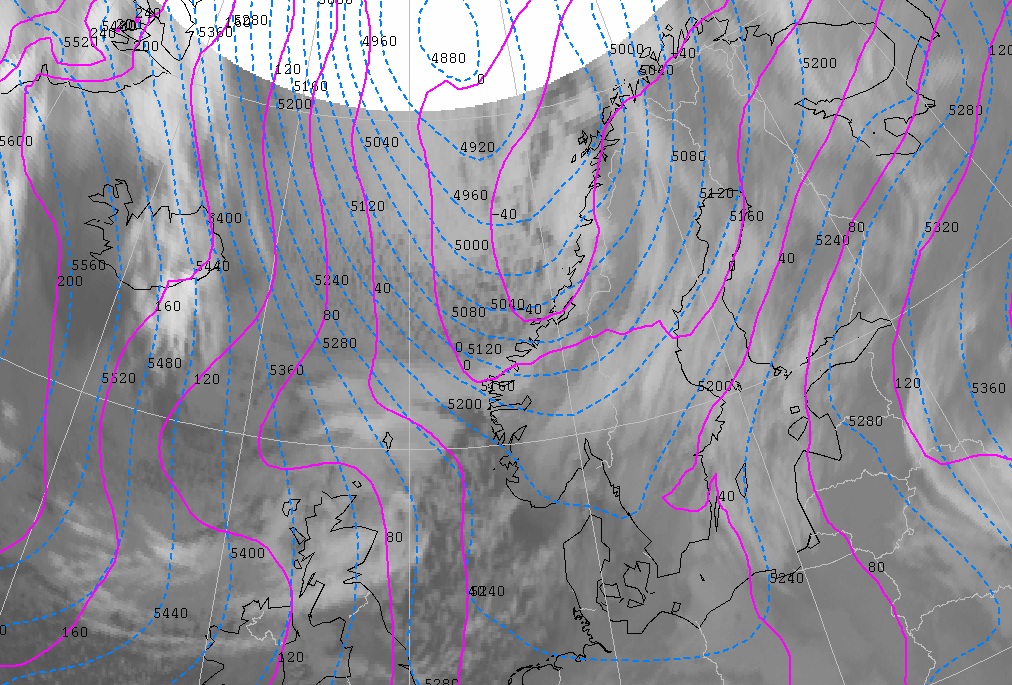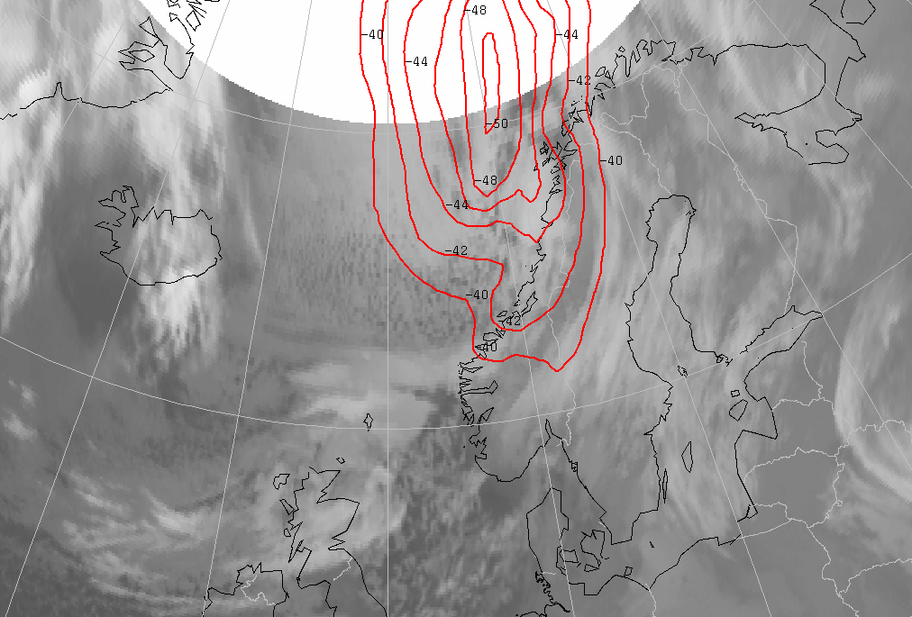 At this time, the low-pressure area west of the Norwegian coast has two separate cores with a central pressure around 990 hPa. The most northern low-level trough is situated ahead of a trough at 500 hPa. The first clouds begin to merge at this time and the tops are becoming brighter, which means they are becoming colder. This is all a result of strong upward motion. The first trough is situated from Northern Ireland towards southern Norway; again an upper level trough at 500 hPa follows this low level trough. This upper trough is preceded by thin, high cloudiness.