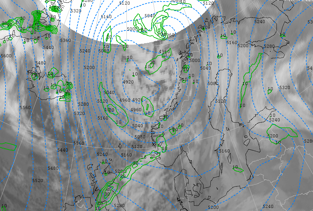 There are different areas of significant positive vorticity advection (PVA) above the clustered cloudiness west of the Norwegian coast. An important maximum of PVA is out of the range of the satellite, as it is too far north. An area of PVA coincides with the rear of a patch of cloudiness on the trough at the northern part of the North Sea. This area of PVA precedes an upper level trough at 500 hPa.