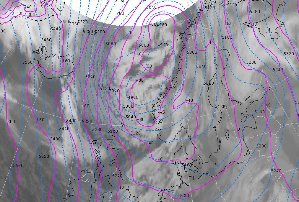 28 January 2004/12.00 UTC - Meteosat IR image; cyan: height contours 500 hPa, magenta: height contours 1000 hPa