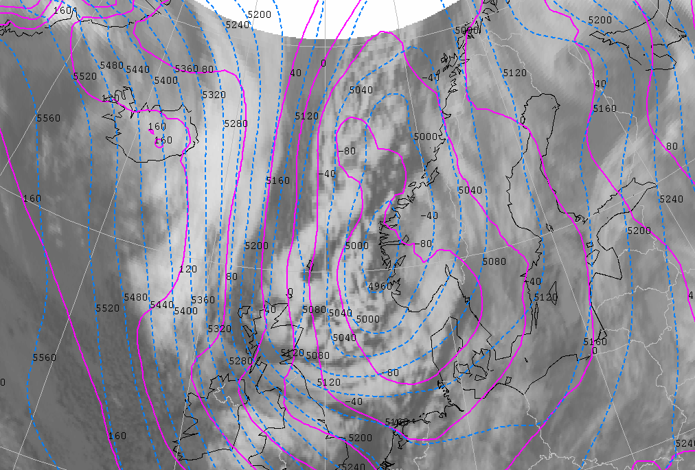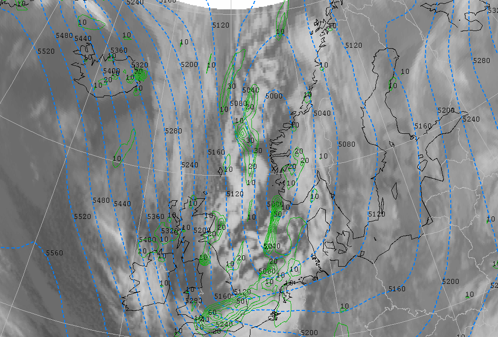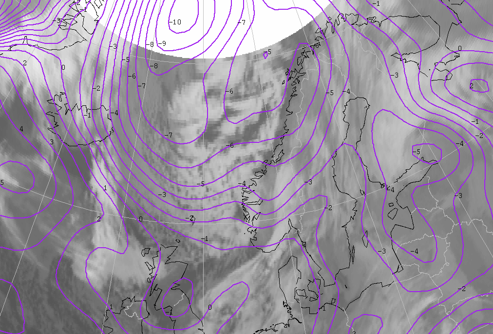 In the meantime, the clouds of the Arctic Front have moved southwards into the North Sea and the centre of the main depression is situated over southern Norway. The arctic front coincides with the low-level trough and is followed by an upper-level trough at 500 hPa. The Arctic Front, which lies from Norway, the British Islands towards Iceland, is clearly visible through its cloudiness, except for the part above the British Isles (see also image of ΘW at 850 hPa below).