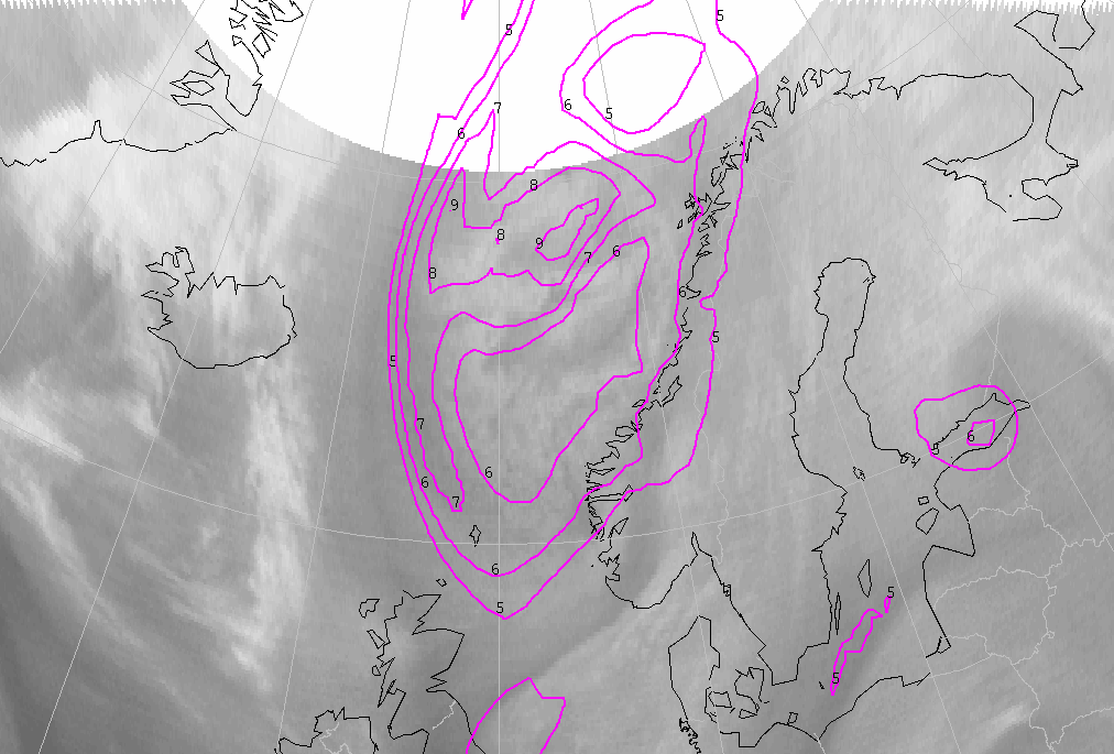The position of the arctic front is clearly visible on the picture above. The strong gradient in ΘW at 850 hPa lies near the front of the cloudiness.