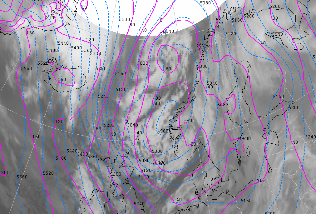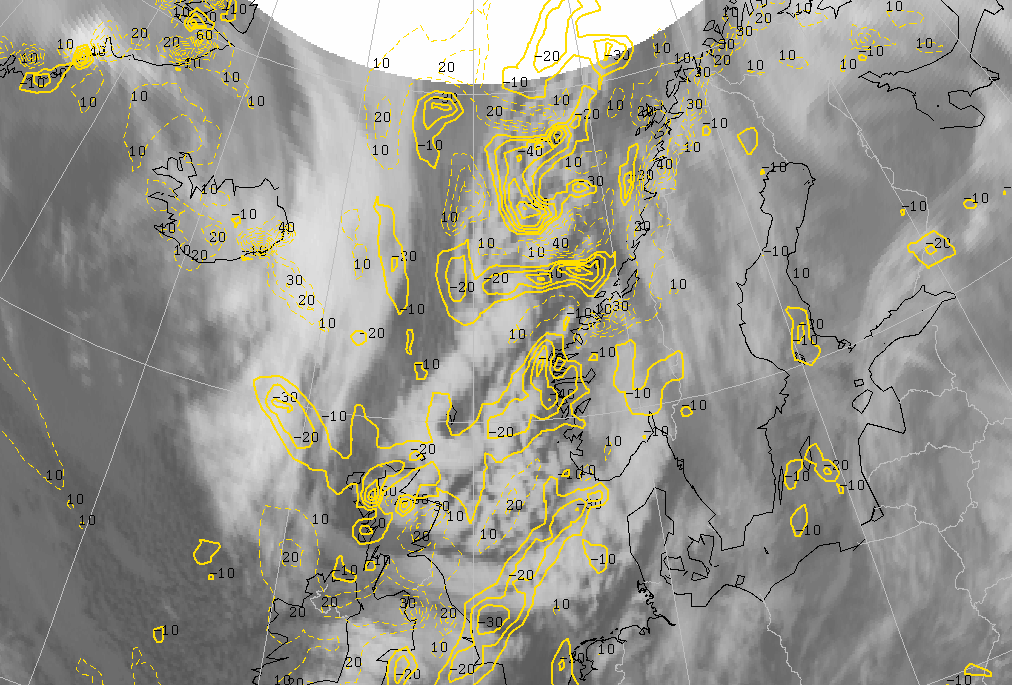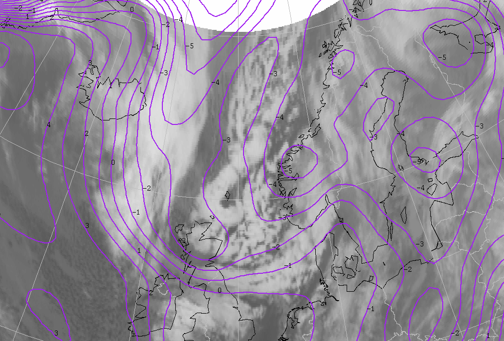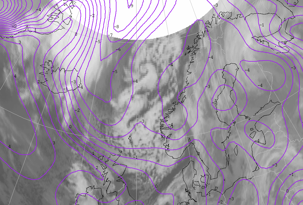 Negative omega values (ascending air) lie over the cloud areas of the two Polar Lows. The Polar Low close to Scotland is surrounded by positive values of omega. The second Polar Low has the strongest negative values and therefore the strongest upward motion.