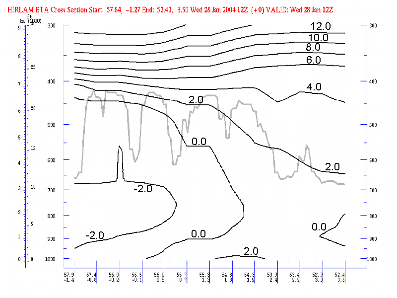 28 January 2004/12.00 UTC - Vertical cross section; black: isentropes (ThetaW), grey: satellite signal