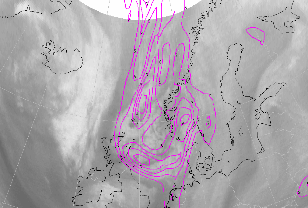 28 January 2004/00.00 UTC - Meteosat WV image; magenta: potential vorticity 303K