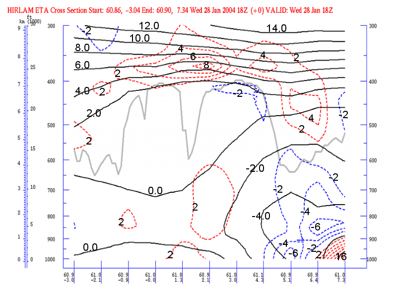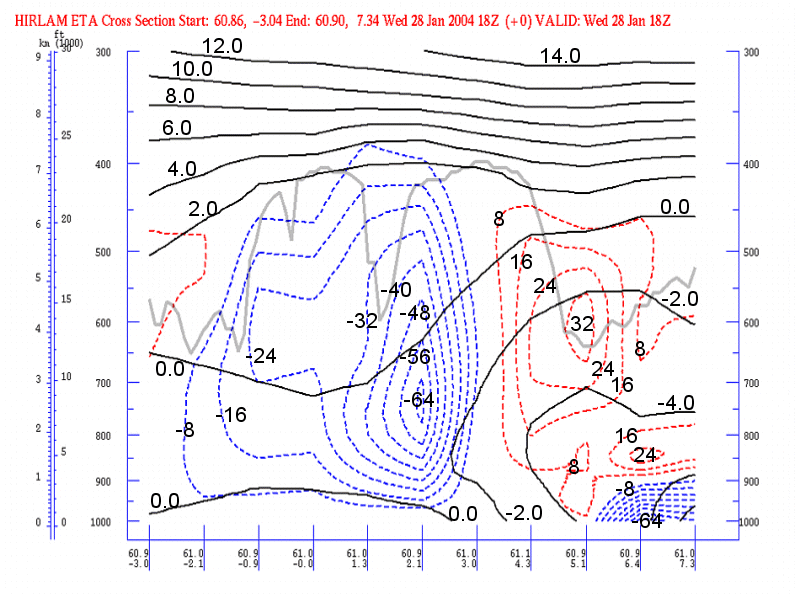 28 January 2004/18.00 UTC - Vertical cross section; black: isentropes (ThetaW), red: vertical motion (omega) - downward motion, blue: