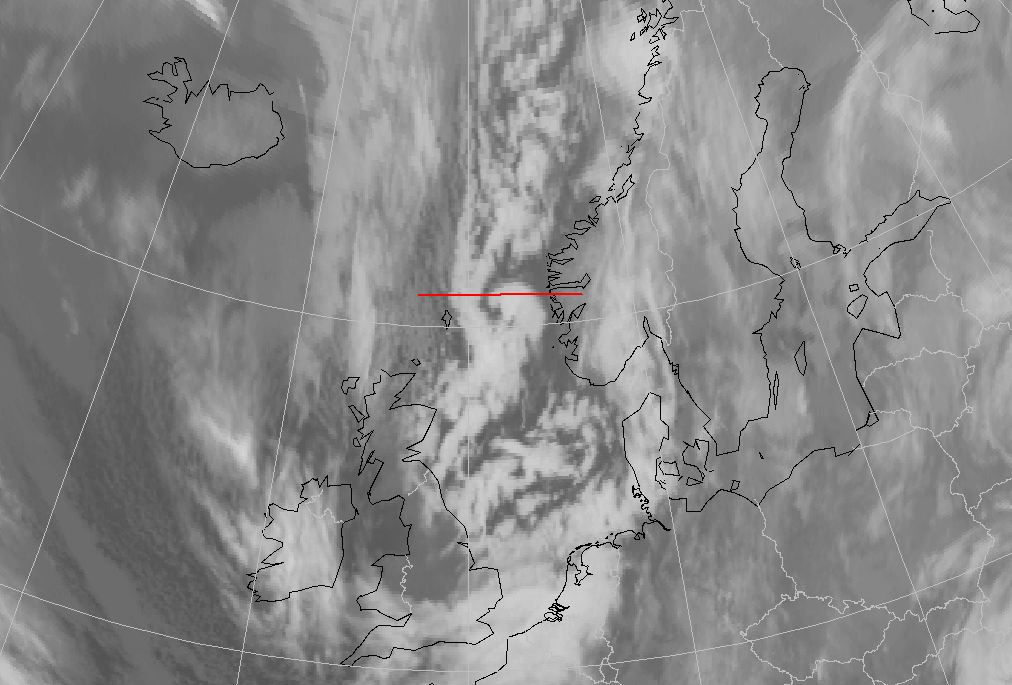 This vertical cross section is made perpendicular to the arctic front, from northwest to southeast. The arctic front is easily recognized in the bending of the isentropes. The corresponding satellite signal clearly reveals the position of the clouds. Higher values of satellite signal result from a whiter colour and higher cloud tops. The Arctic Front is visible up to about 450 hPa.