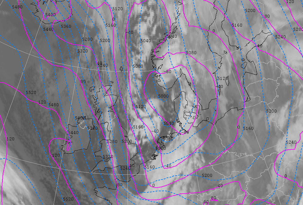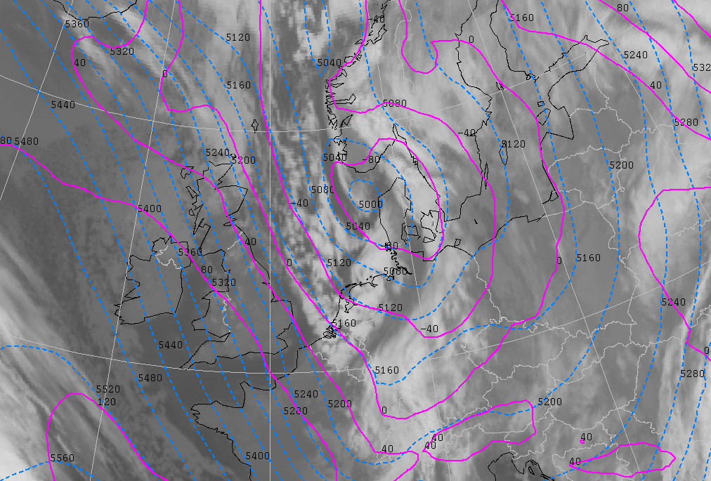 29 January 2004/06.00 UTC - Meteosat IR image; cyan: height contours 500 hPa, magenta: height contours 1000 hPa