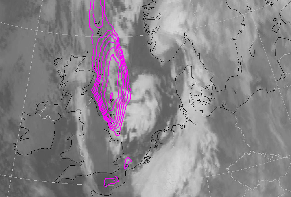 Maximum wind speed at this time is 40 knots. This maximum can be found along the west side of the Polar Low, the area where the gradient of isobars is situated. Stations along the east coast of Britain report wind gusts up to 48 knots.