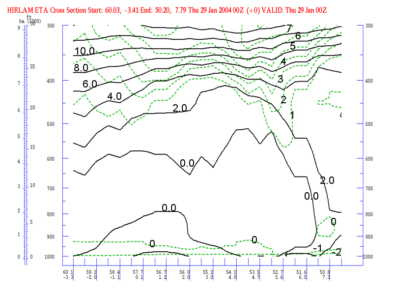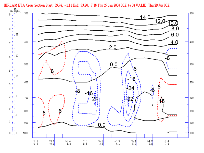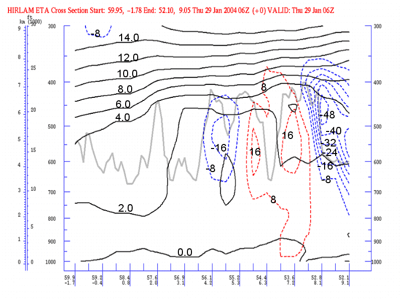 29 January 2004/00.00 UTC - Vertical cross section; black: isentropes (ThetaW), red: vertical motion (omega) - downward motion, blue: