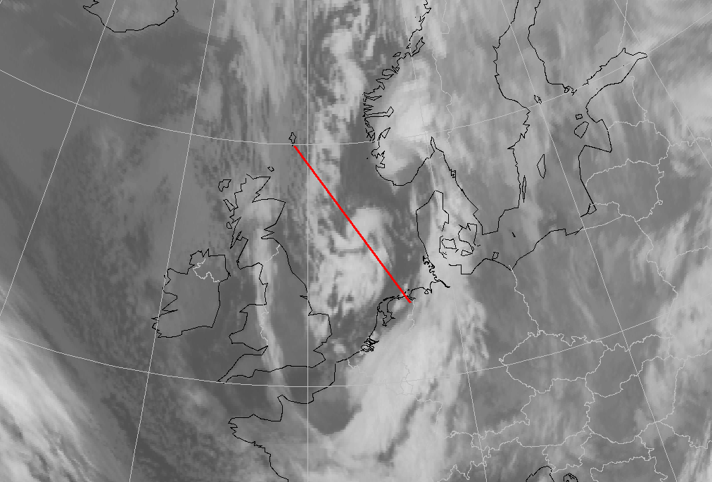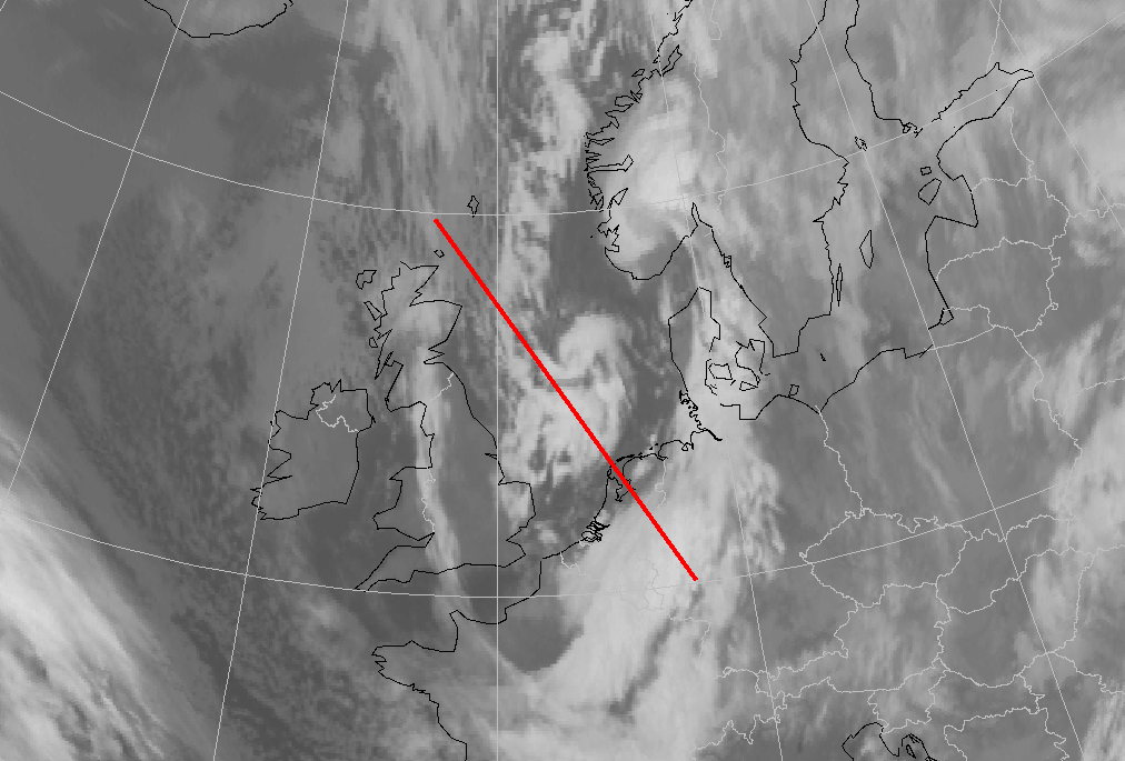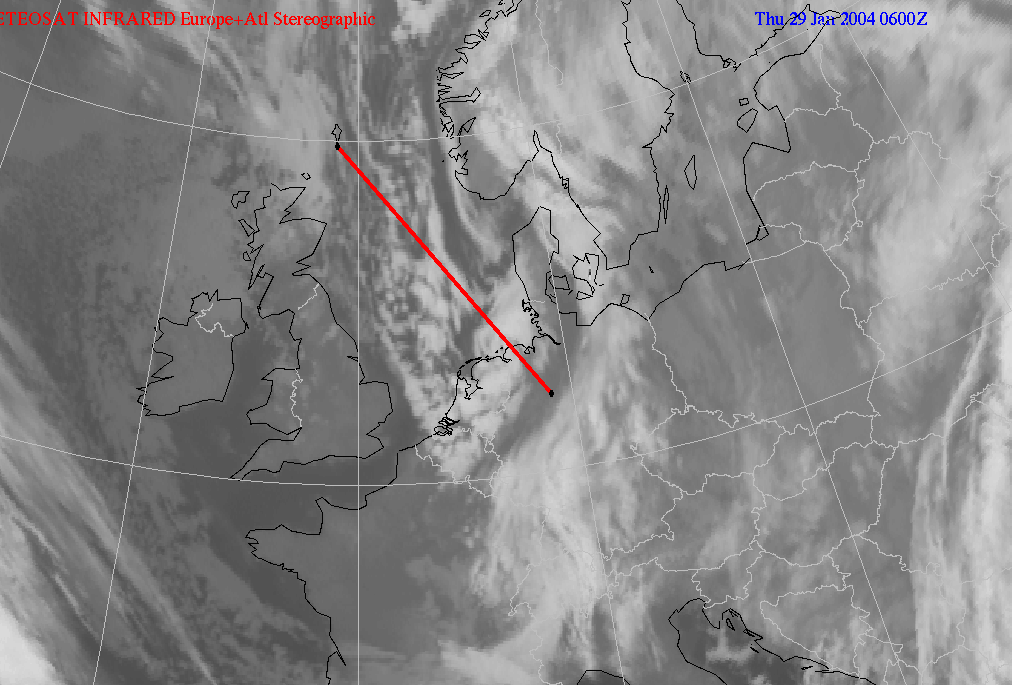 29 January 2004/00.00 UTC - Meteosat IR image; position of vertical cross section indicated