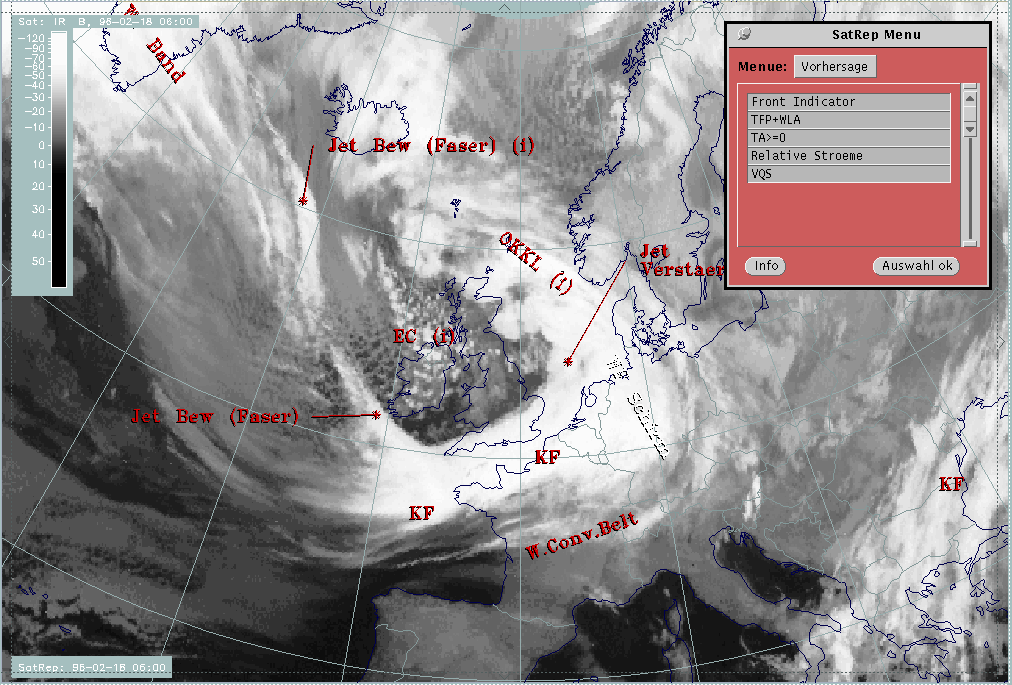 18 February 1996/06.00 UTC - Meteosat IR image; SatRep overlay: names of conceptual models; SatRep menu: key parameters for Warm Front
