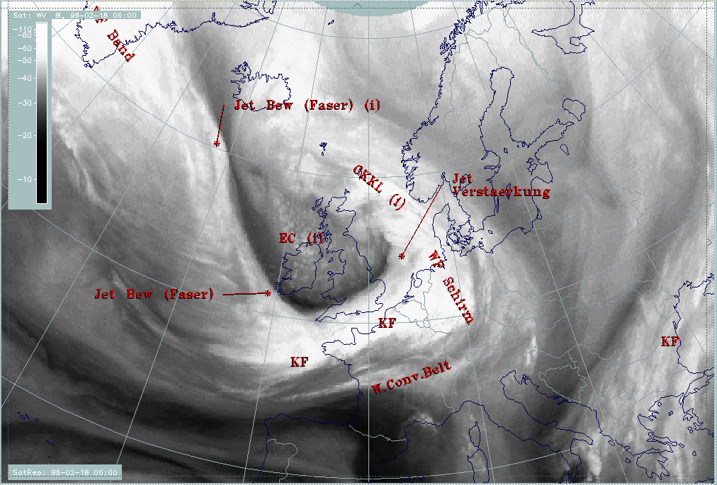 18 February 1996/06.00 UTC - Meteosat WV image; SatRep overlay: names of conceptual models