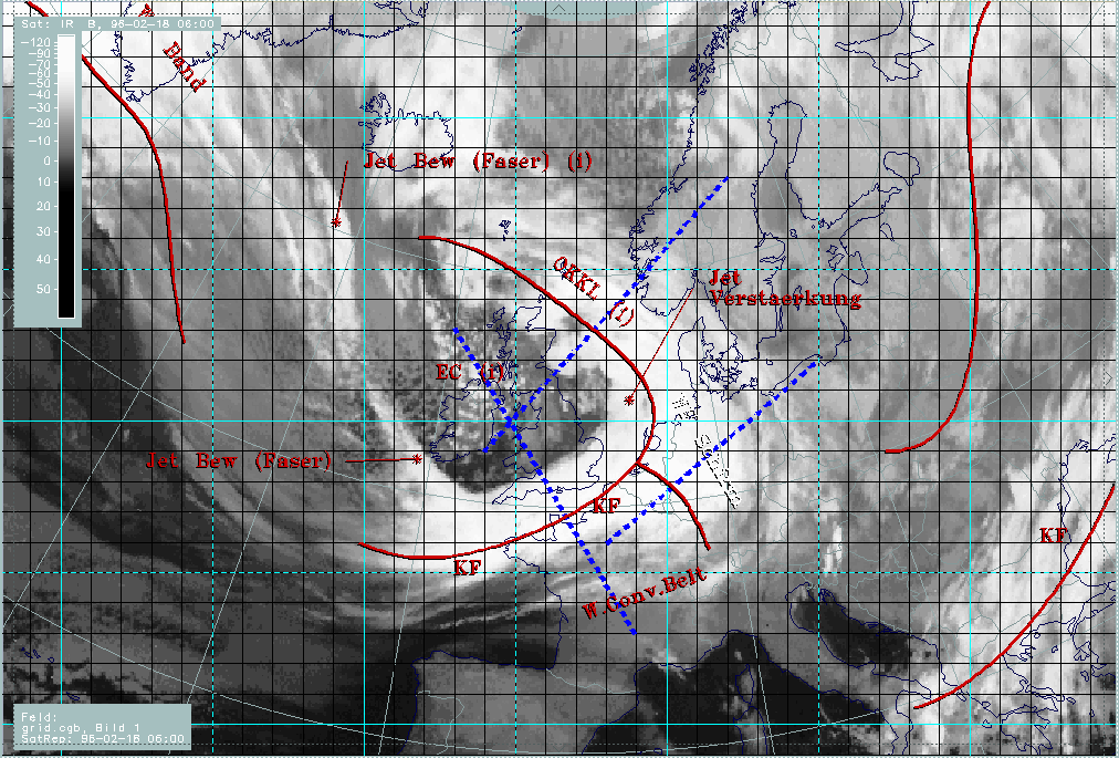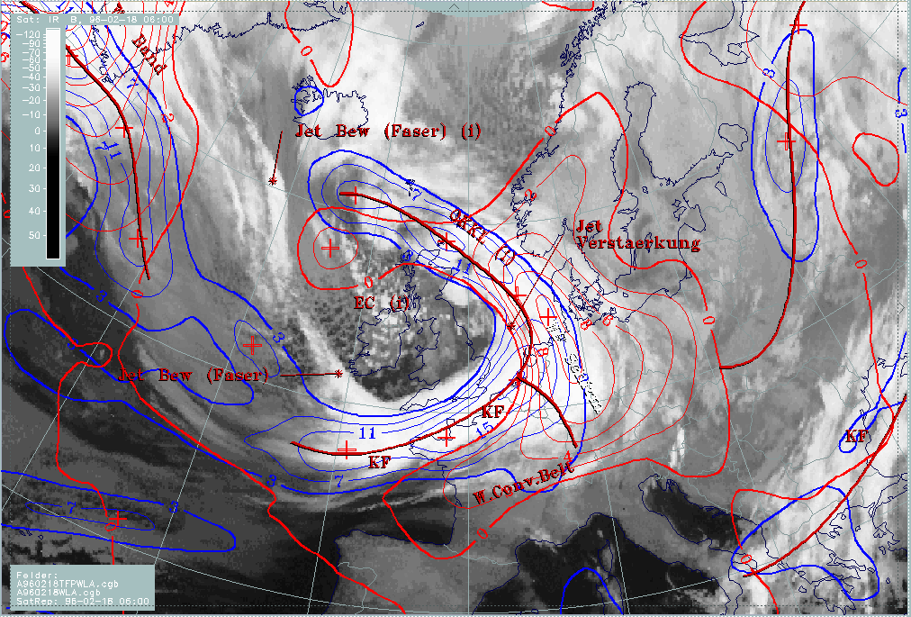 18 February 1996/06.00 UTC - Meteosat IR image; blue: thermal front parameter (TFP) 500/850 hPa, red thick: front indicator, red:
