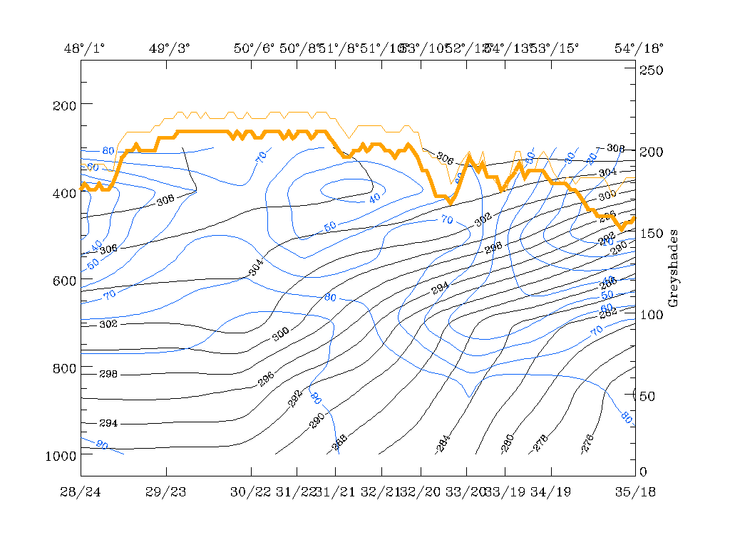 18 February 1996/06.00 UTC - Vertical cross section; black: isentropes (ThetaE), blue: relative humidity, orange thin: IR pixel values,