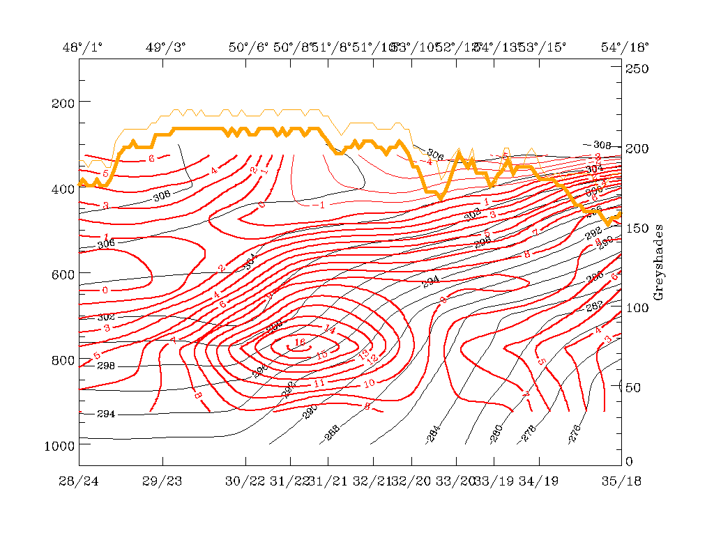 The black lines in the two cross sections represent equivalent potential temperatures and show a broad crowding zone and a zone of high gradients of isentropes. Such a zone indicates a frontal surface in showing the quick change of temperature (the temperature discontinuity) taking place at fronts. In this case the zone of highest gradients rises from the surface at about 50N/08E up to a layer of 500 - 400 hPa at approximately 54N/18E.