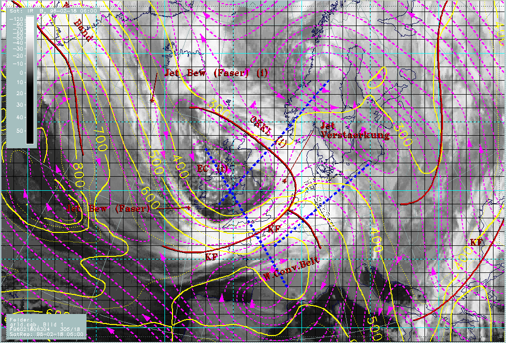 18 February 1996/06.00 UTC - Meteosat IR image; magenta: relative streams 305K - system velocity 305° 18m/s, yellow: isobars, red: