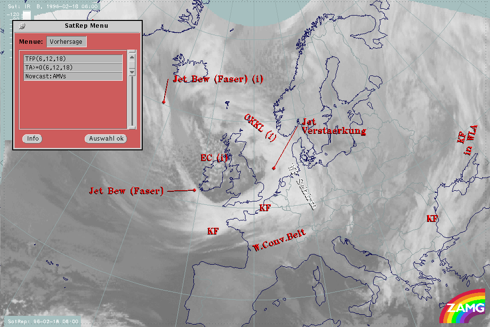 18 February 1996/06.00 UTC - Meteosat IR image; red thick: front indicator, SatRep overlay: names of conceptual models; SatRep menu: