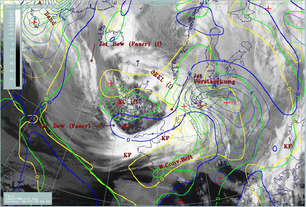 18 February 1996/06.00 UTC - Meteosat IR image; SatRep overlay: names of conceptual models; yellow: positive vorticity advection (PVA)