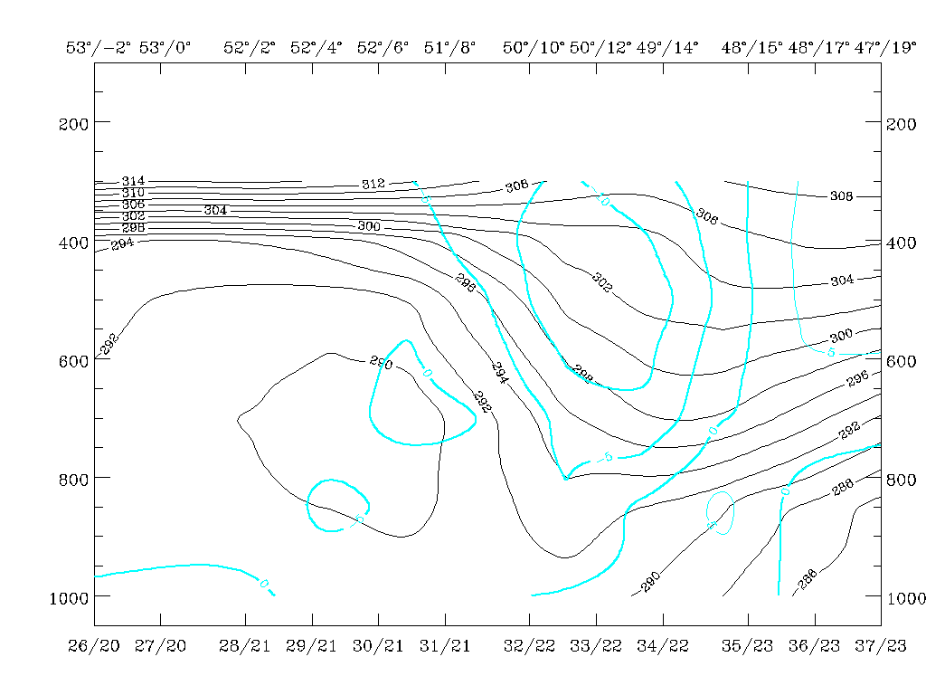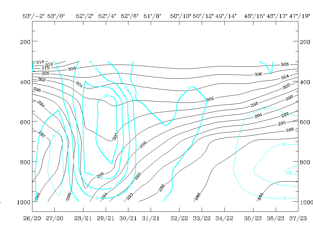 The black lines in the two cross sections represent equivalent potential temperatures and show a broad crowding zone and a zone of high gradients of isentropes. Such a zone indicates a frontal surface in showing the quick change of temperature (the temperature discontinuity) taking place at fronts. In this case the zone of highest gradients rises from the surface at about 50N/08E up to a layer of 500 - 400 hPa at approximately 54N/18E.