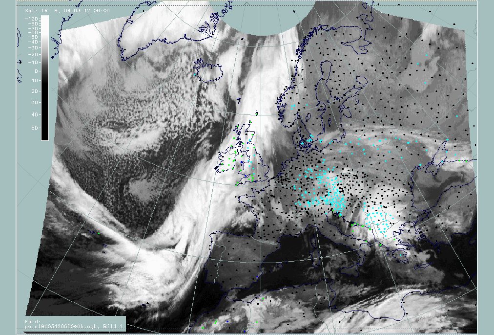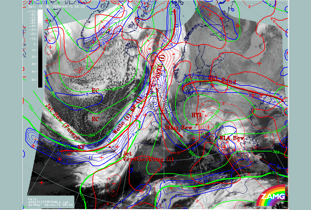 12 March 1996/06.00 UTC - Meteosat IR image; red thick: front indicator, blue: thermal front parameter (TFP) 500/850 hPa, green: