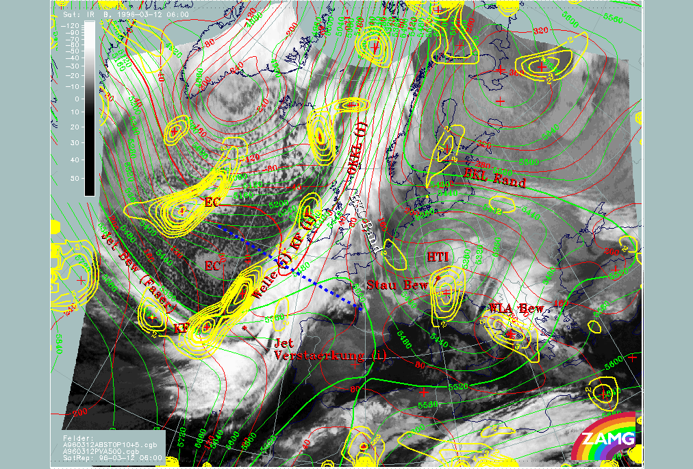 12 March 1996/06.00 UTC - Meteosat IR image; red thick: front indicator, red: height contours 1000 hPa, green: height contours 500 hPa,