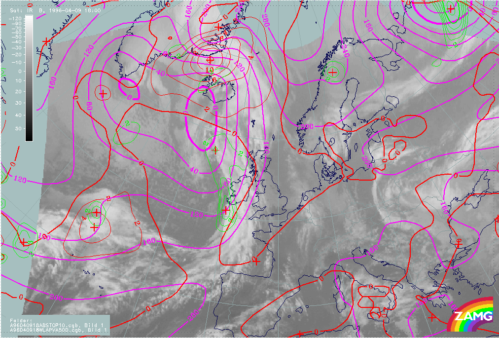 09 April 1996/18.00 UTC - Meteosat IR image; magenta: height contours 1000 hPa, green: positive vorticity advection (PVA) 500 hPa, red: