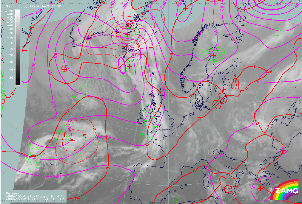 10 April 1996/00.00 UTC - Meteosat IR image; magenta: height contours 1000 hPa, green: positive vorticity advection (PVA) 500 hPa, red: