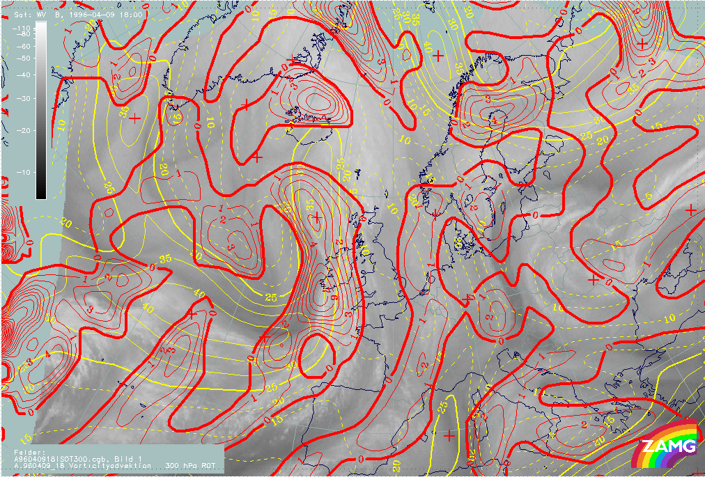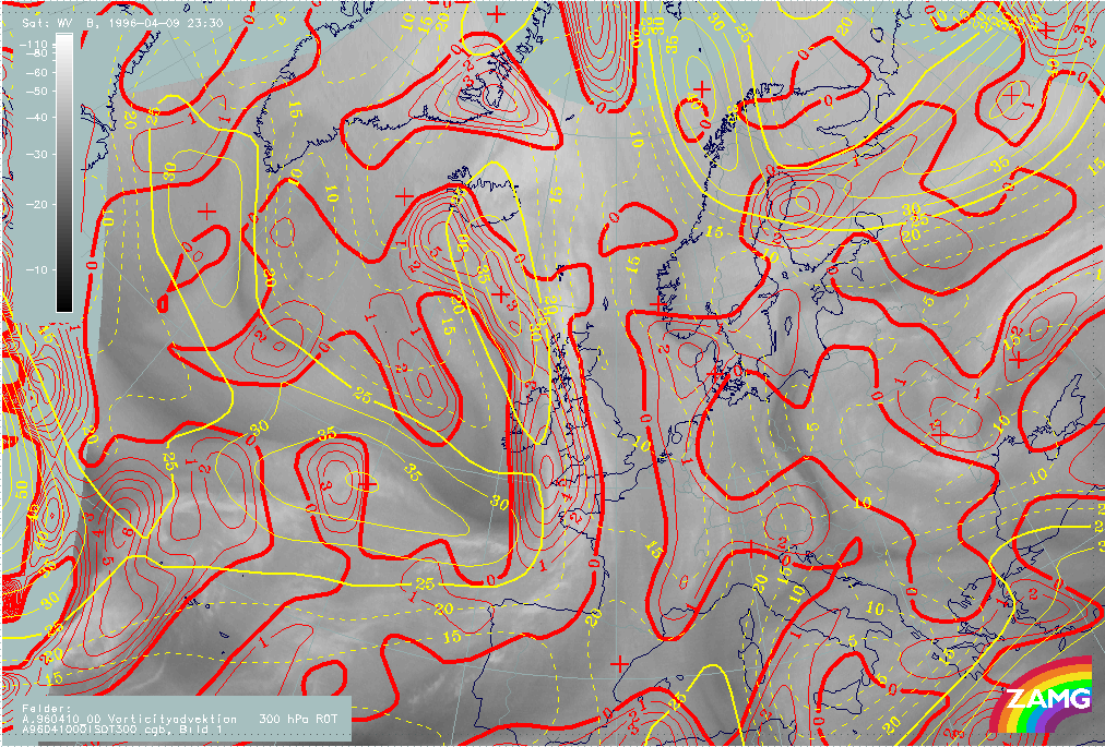 09 April 1996/19.00 UTC - Meteosat WV image; yellow: isotachs 300 hPa, red: positive vorticity advection (PVA) 300 hPa