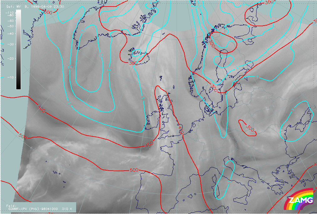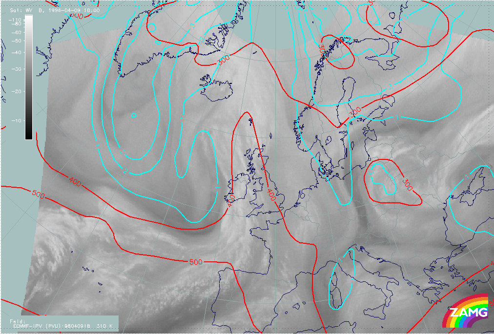 09 April 1996/18.00 UTC - Meteosat WV image; cyan: potential vorticity 310K, red: isobars