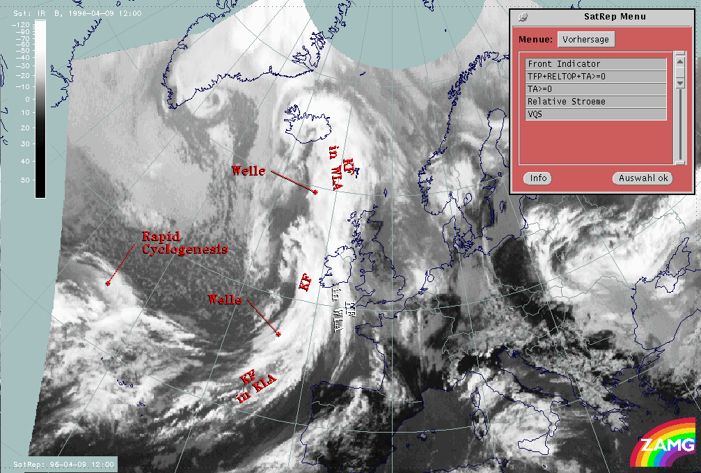 09 April 1996/12.00 UTC - Meteosat IR image; SatRep overlay: names of conceptual models, SatRep menu: key parameters for Cold Front in