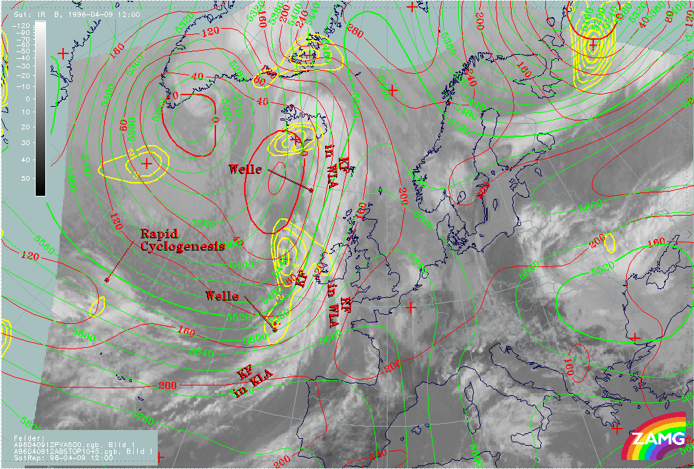 09 April 1996/12.00 UTC - Meteosat IR image; green: height contours 500 hPa, red: height contours 1000 hPa, yellow: positive vorticity