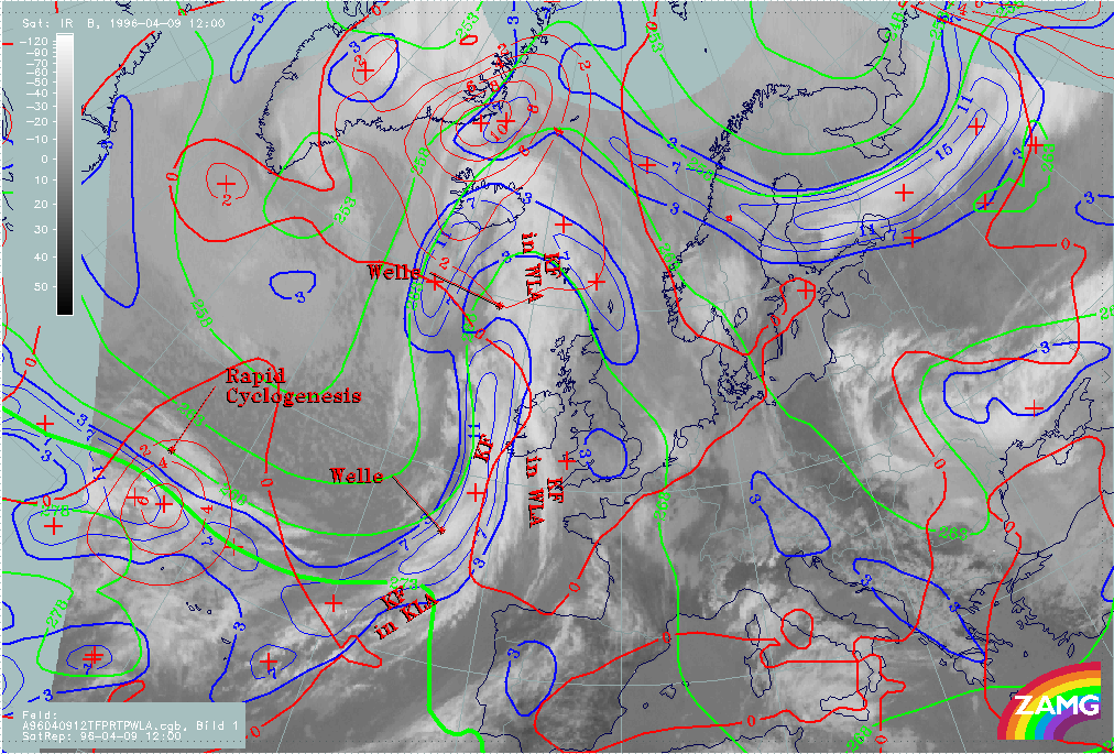09 April 1996/12.00 UTC - Meteosat IR image; blue: thermal front parameter (TFP) 500/850 hPa, green: equivalent thickness 500/850 hPa,
