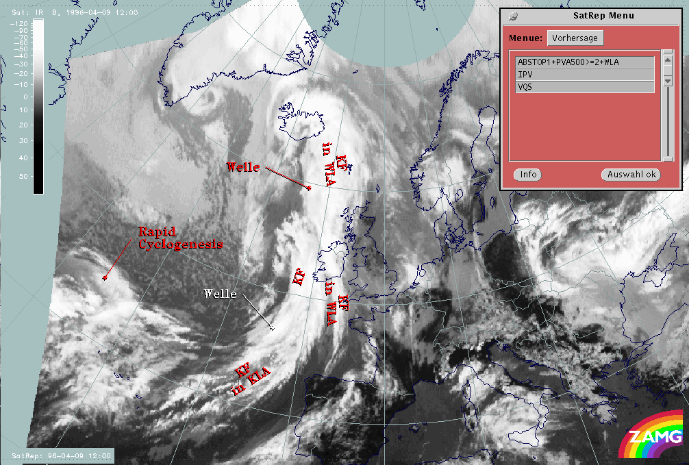 09 April 1996/12.00 UTC - Meteosat IR image; SatRep overlay: names of conceptual models, SatRep menu: key parameters for Wave
