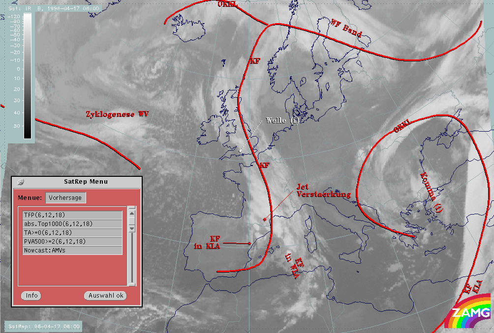 17 April 1996/06.00 UTC - Meteosat IR image; SatRep overlay: names of conceptual models, SatRep menu: key parameters for Wave forecast