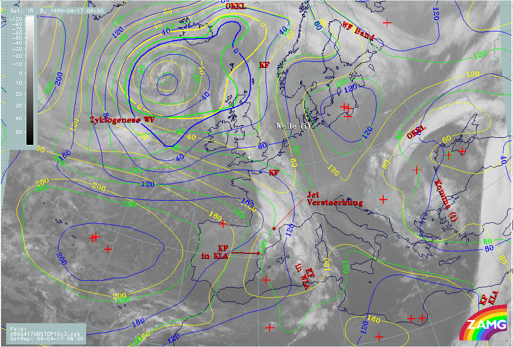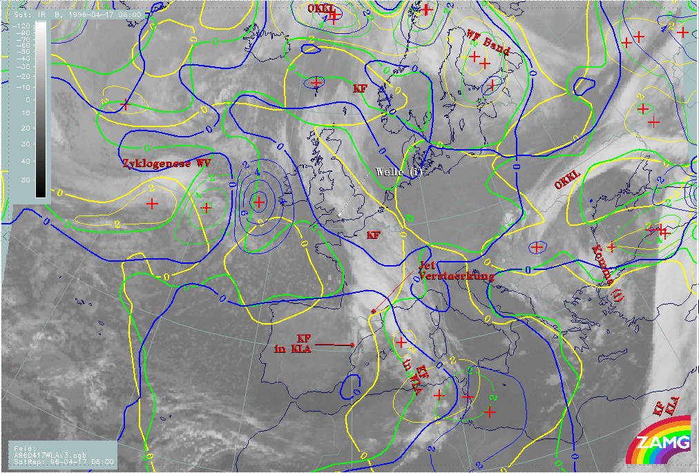 17 April 1996/06.00 UTC - Meteosat IR image; yellow: positive vorticity advection (PVA) 500 hPa 06.00 UTC, green: positive vorticity