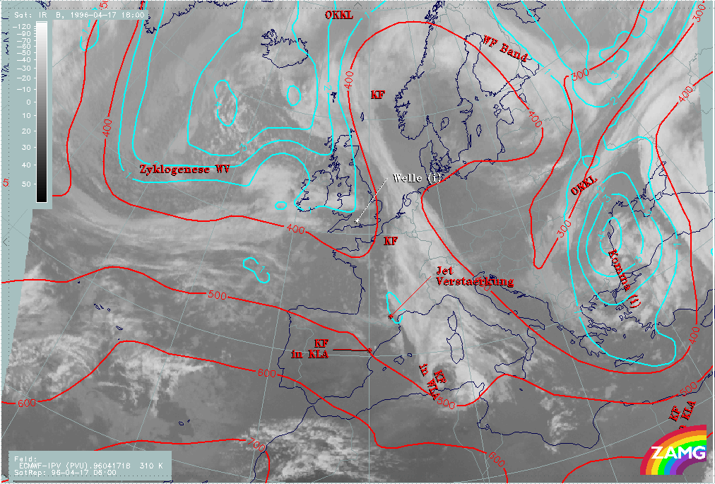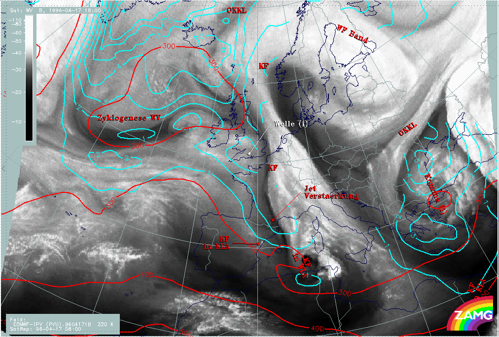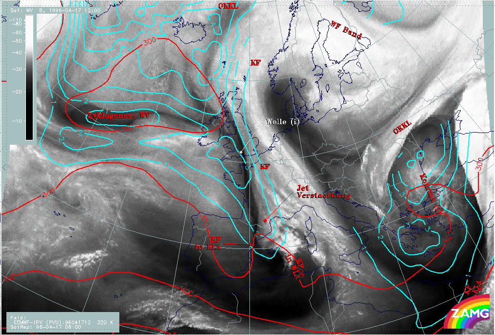 17 April 1996/12.00 UTC - Meteosat WV image; cyan: potential vorticity (PV) 320K, red: isobars; SatRep overlay: names of conceptual
