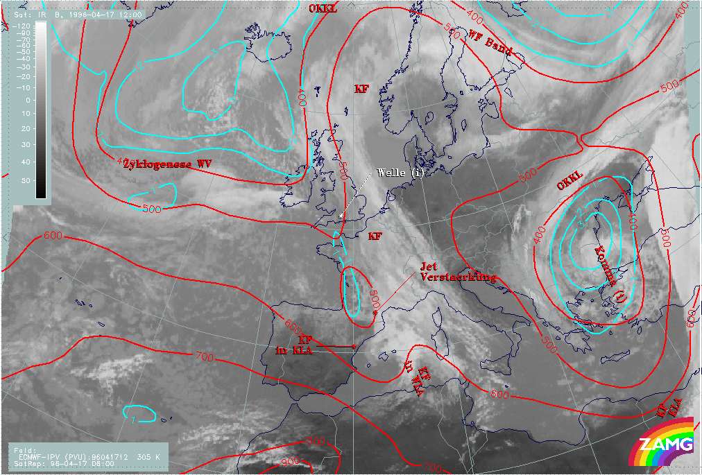 17 April 1996/12.00 UTC - Meteosat WV image; cyan: potential vorticity (PV) 305K, red: isobars; SatRep overlay: names of conceptual