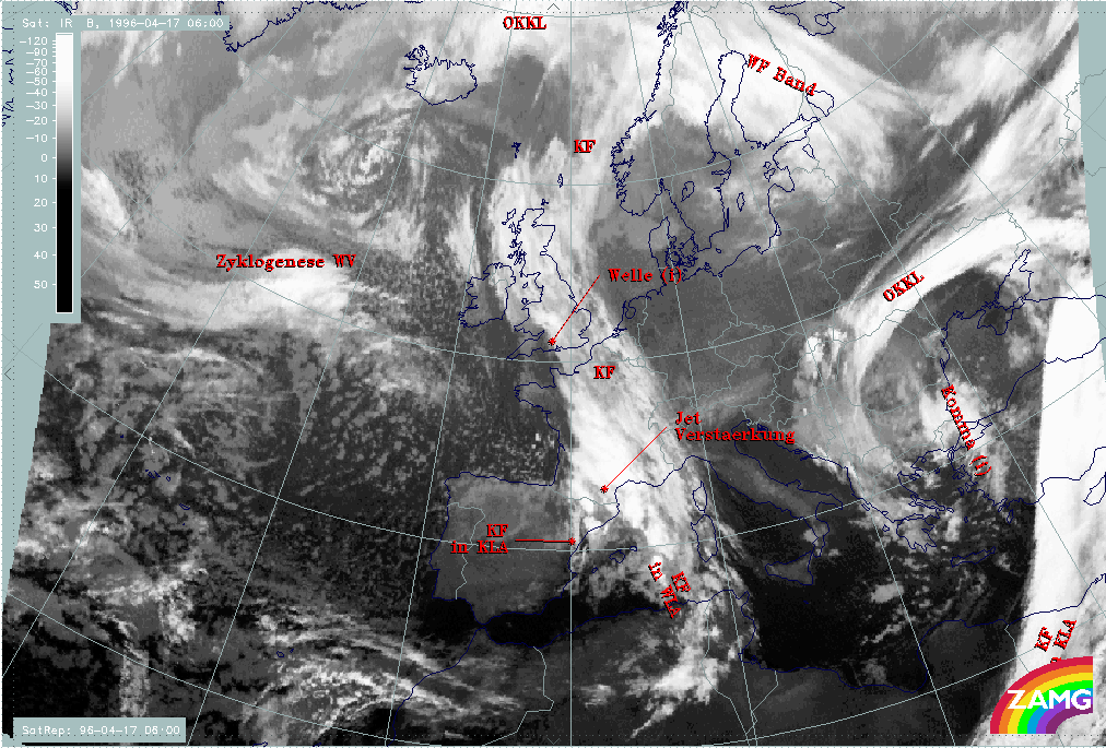 17 April 1996/06.00 UTC - Meteosat IR image; SatRep overlay: names of conceptual models