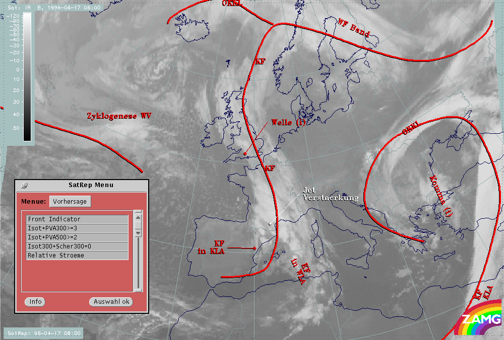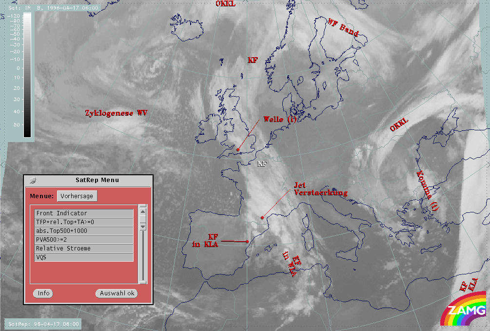 17 April 1996/06.00 UTC - Meteosat IR image; red thick: front indicator; SatRep overlay: names of conceptual models, SatRep menu: key