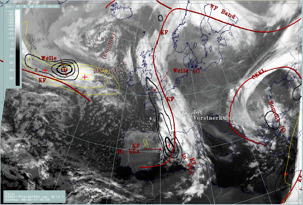 17 April 1996/06.00 UTC - Meteosat IR image; ECMWF analysis data; black: positive vorticity advection (PVA) 500 hPa, yellow: isotachs