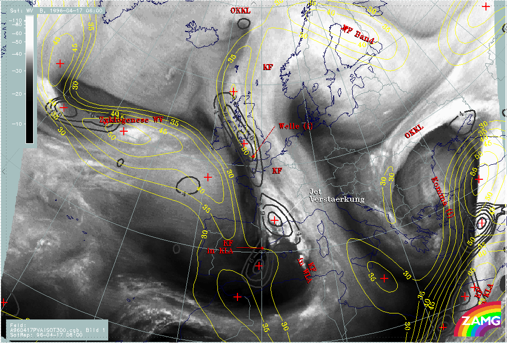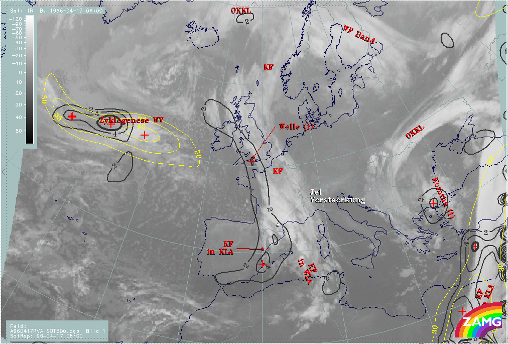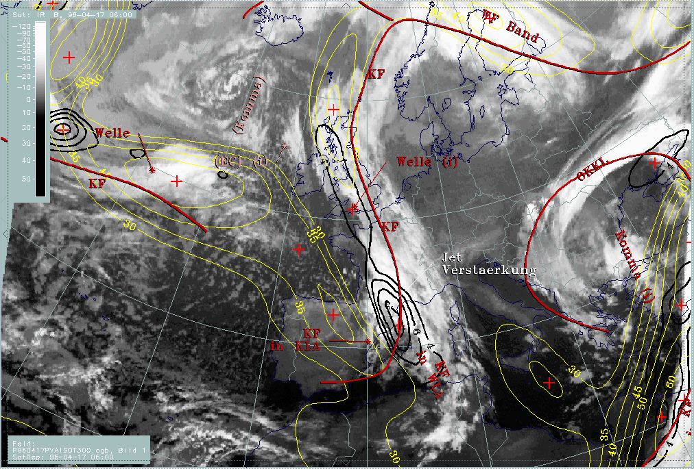 17 April 1996/06.00 UTC - Meteosat IR image; ECMWF analysis data; black: positive vorticity advection (PVA) 300 hPa, yellow: isotachs